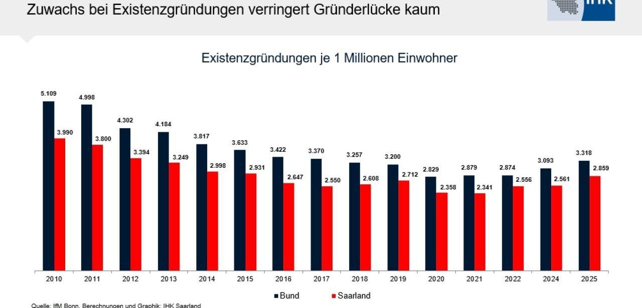 2025 erreichte das Saarland mit 2.882 gewerblichen Neugründungen eine Steigerung von 11,1 Prozent gegenüber dem Vorjahr und übertraf damit den Bundesdurchschnitt von 7,2 Prozent. Zahlreiche Initiativen wie das Starter-Stipendium oder der Business Angels Starterfonds verbesserten die Kapital- und Expertenförderung, konnten jedoch den Gründungssaldounterschied von 459 Gründungen pro Million Einwohner nicht aufheben. Parallel dazu betreute die IHK Saarland 447 Unternehmensgründungs- und Nachfolgevorhaben mit praxisorientierten Workshops, individueller Beratung und intensiver fachlicher Begleitung.